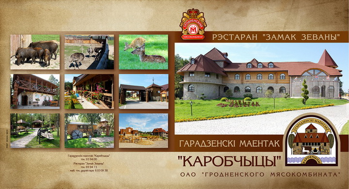 Nowadays there is a stable for horses and ponies of different kinds at the Garadzenski maentak Karobchyzy. A riding-house is situated nearby where under the trainer’s control one may ride a horse or a pony. One may go by a coach for an overview excursion with a guide who will tell about the diversity of flora and fauna at the Garadzenski maentak Karobchyzy. Newly-married couples may order a wedding cortege for a walk. For concerts and holiday actions a stage is constructed and 150 places for viewers. In the middle of the estate there is a territory where wild animals such as wild boars and deer are free. Visitors get the opportunity to watch them closely during the excursion. There are tens of exotic birds in the open-air cages at the Garadzenski maentak Karobchyzy. There is a arbour at the lake side where one may have a rest and enjoy pleasant atmosphere. Beside the lake at a small rivulet open-air cages with birds, wild and domestic animals are situated. After having the overview excursion through the territory of Garadzenski maentak Karobchyzy which takes 1.5-2 hours you have opportunity to have a rest at a restaurant Zamak Zevany where you may taste traditional special drink modovyha which is made according to the receipts of our forefathers.